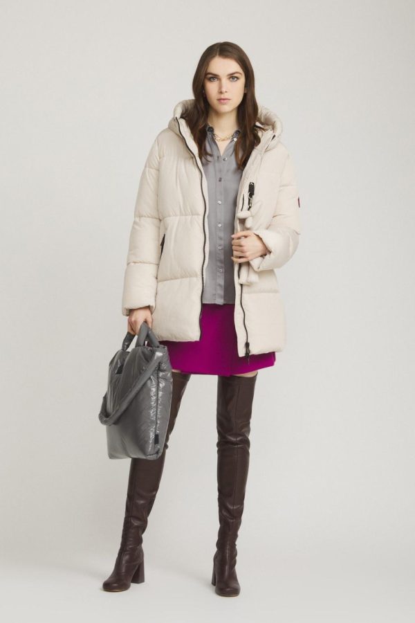 Midi puffer jacket with wide neck, stitching, zipped pockets and zipper.