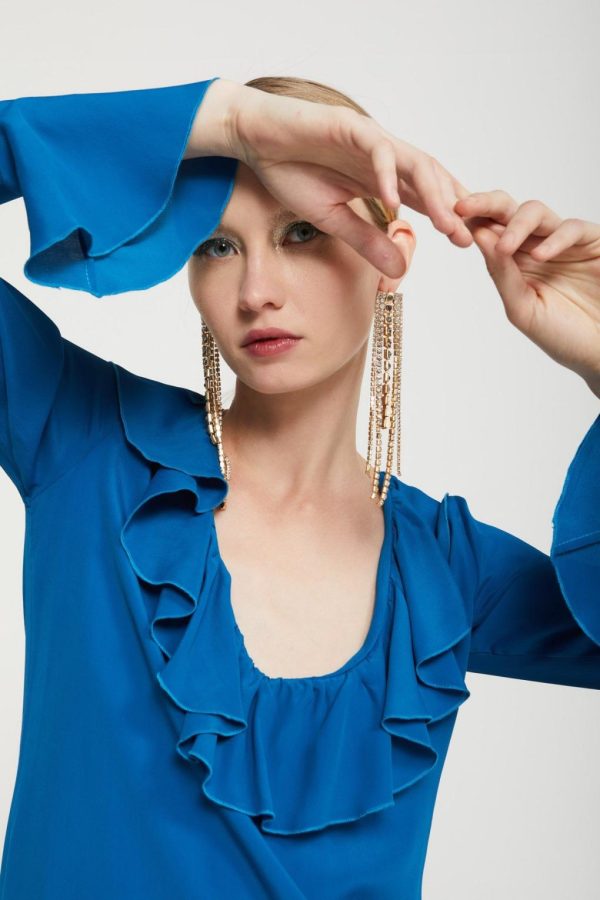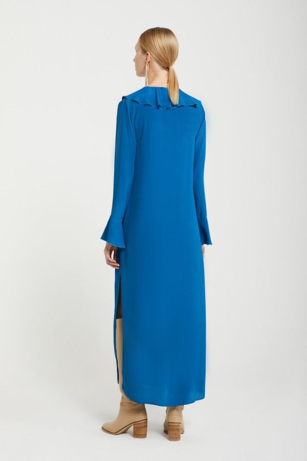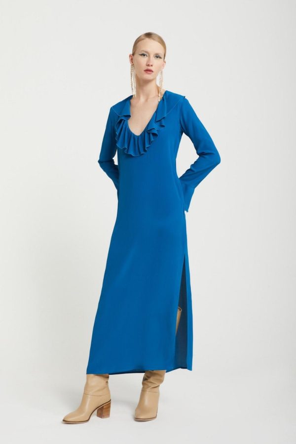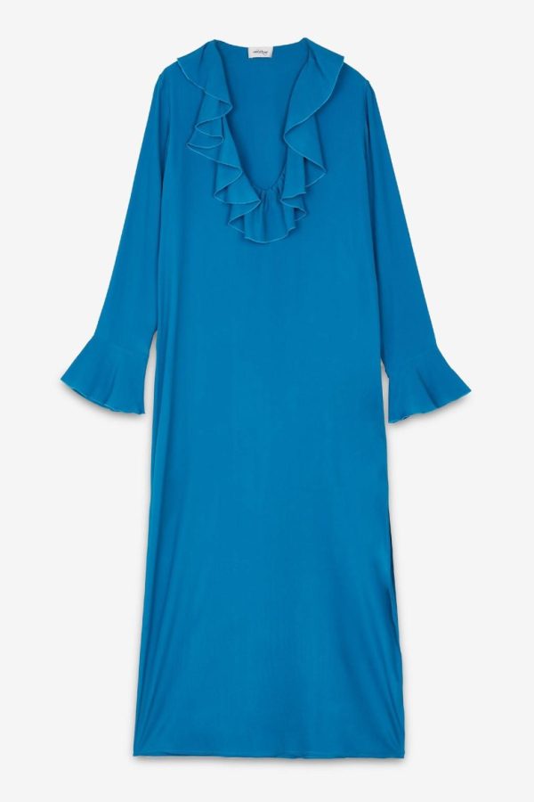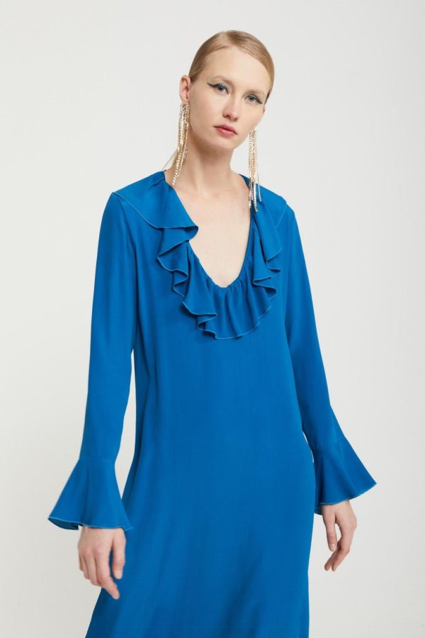 Silk-blend fluid long dress with neck with ruches and flared sleeves.