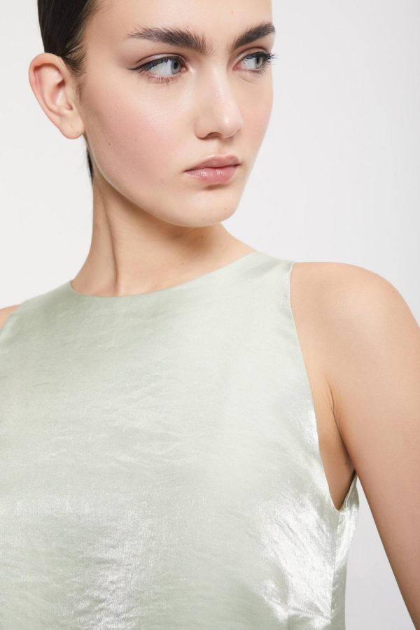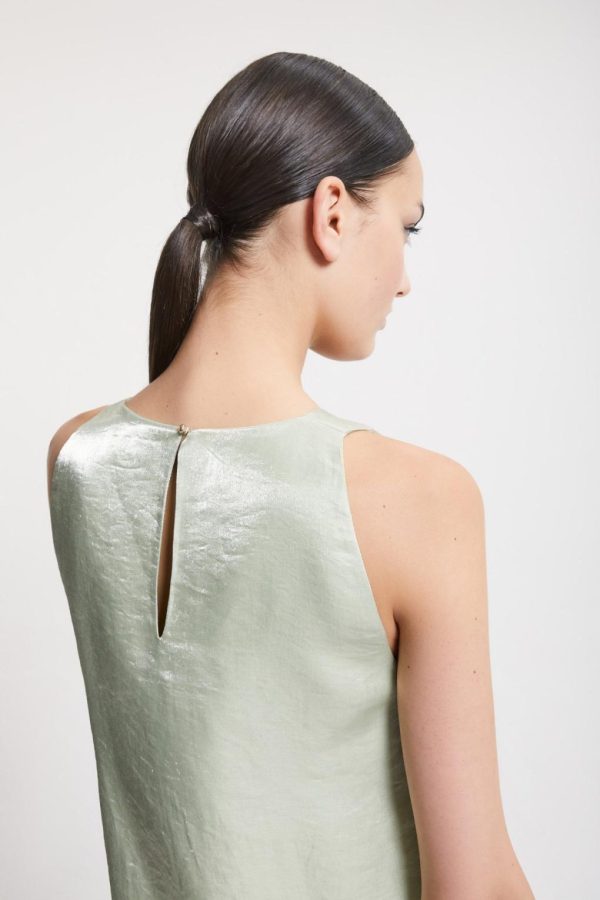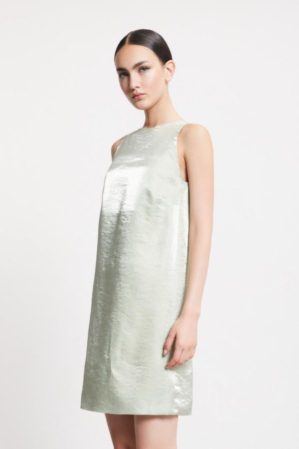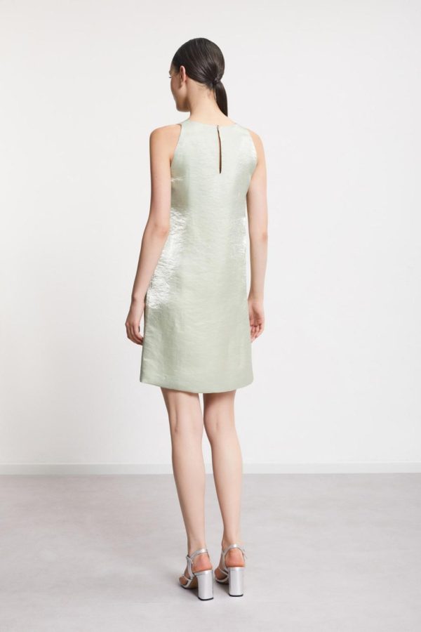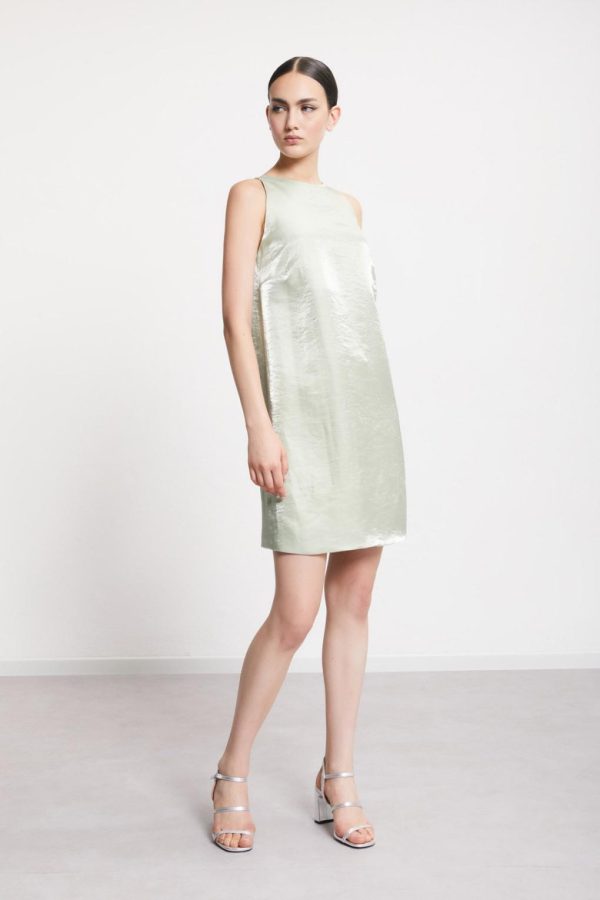 Viscose and trilobate linen short dress with satin effect and keyhole back opening.