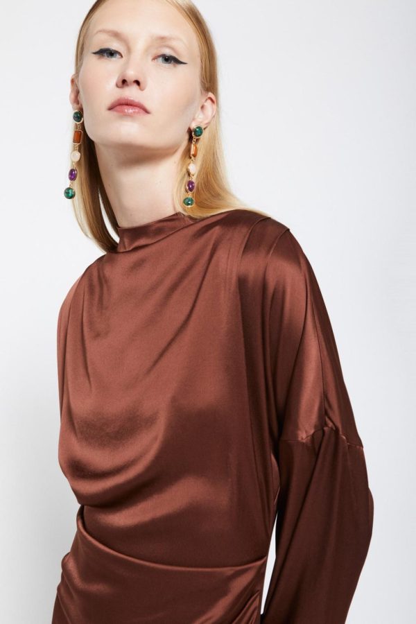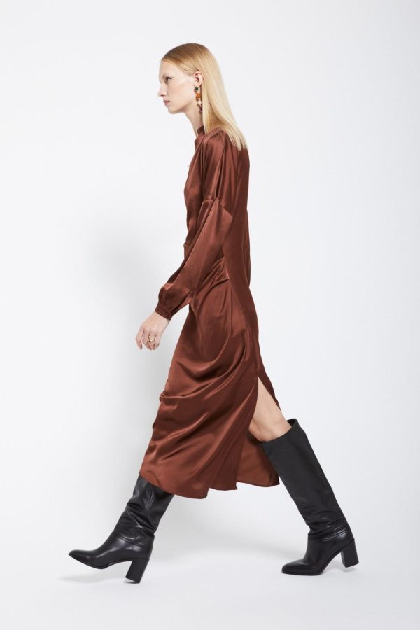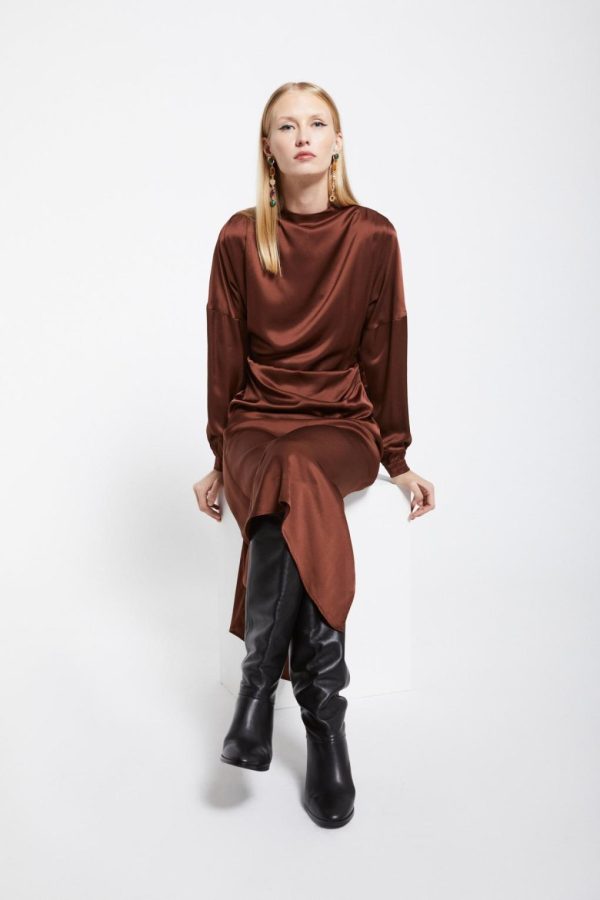 Pure viscose fluid long dress with turtleneck and long sleeve.