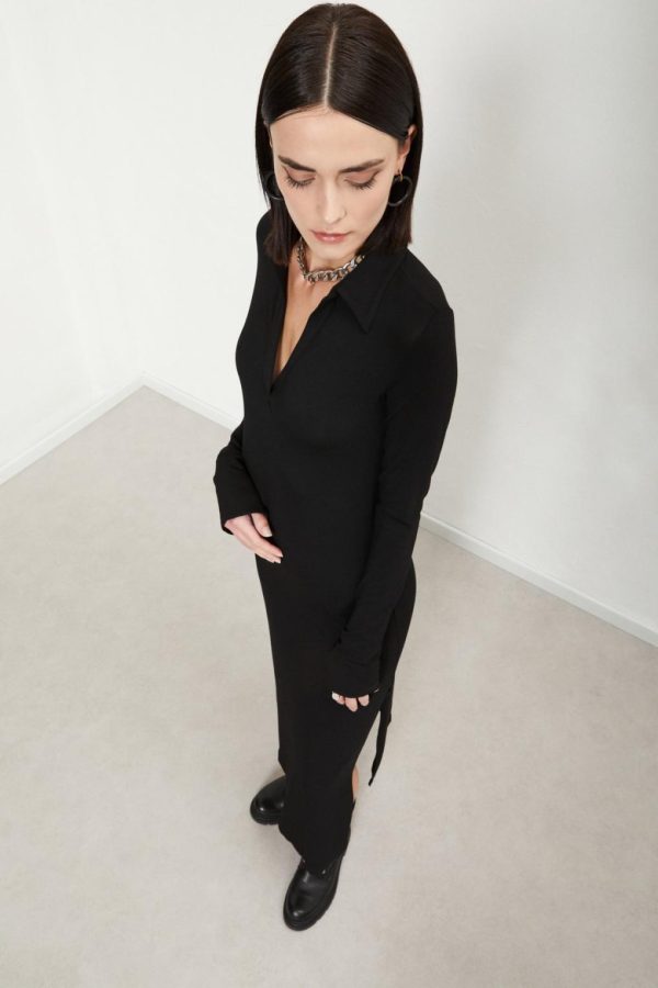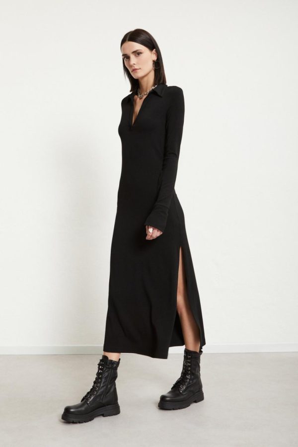 Pure stretch viscose long dress with V neck and slits on the bottom.