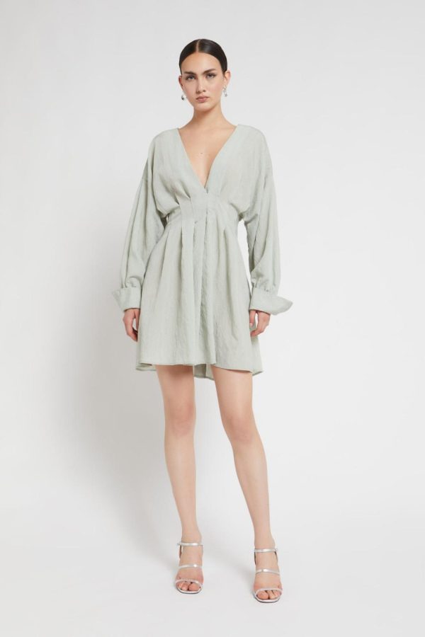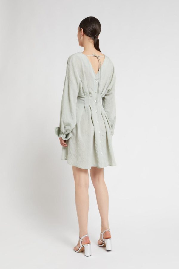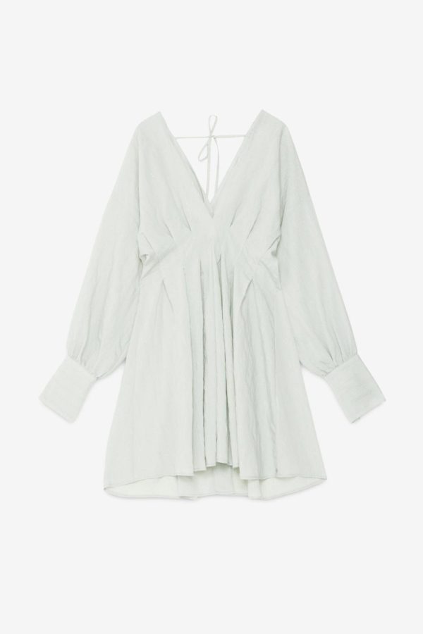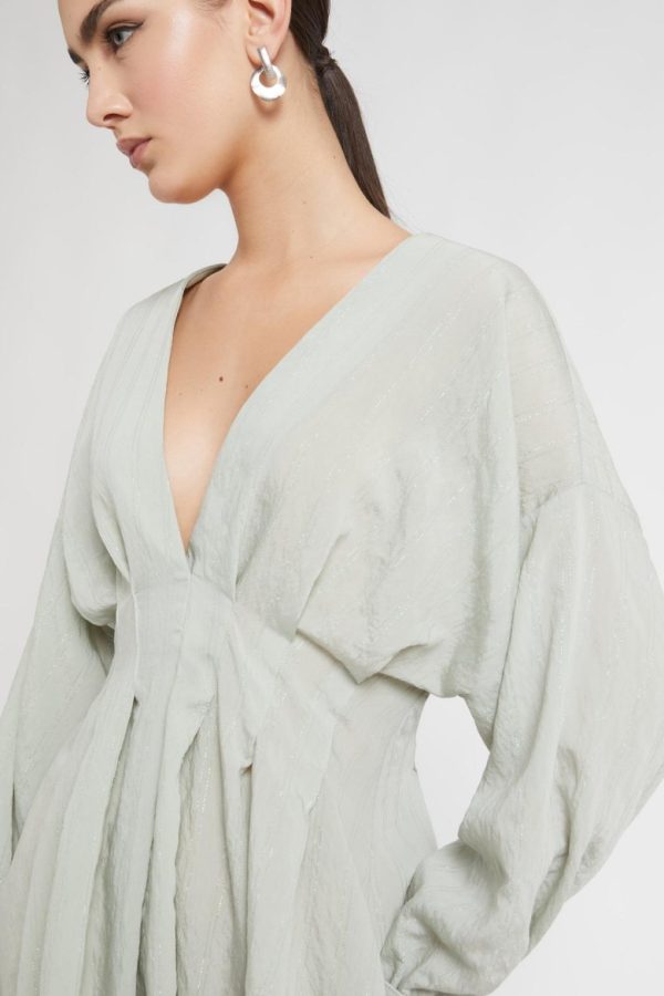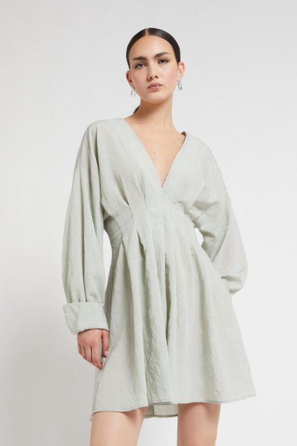 Pinstriped viscose short dress, with lurex, buttons, pleats and V-neck.