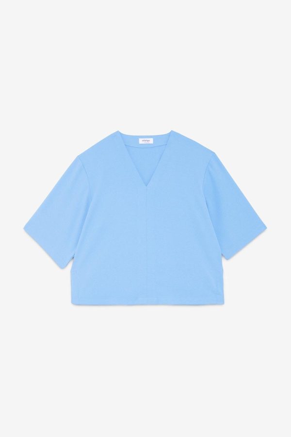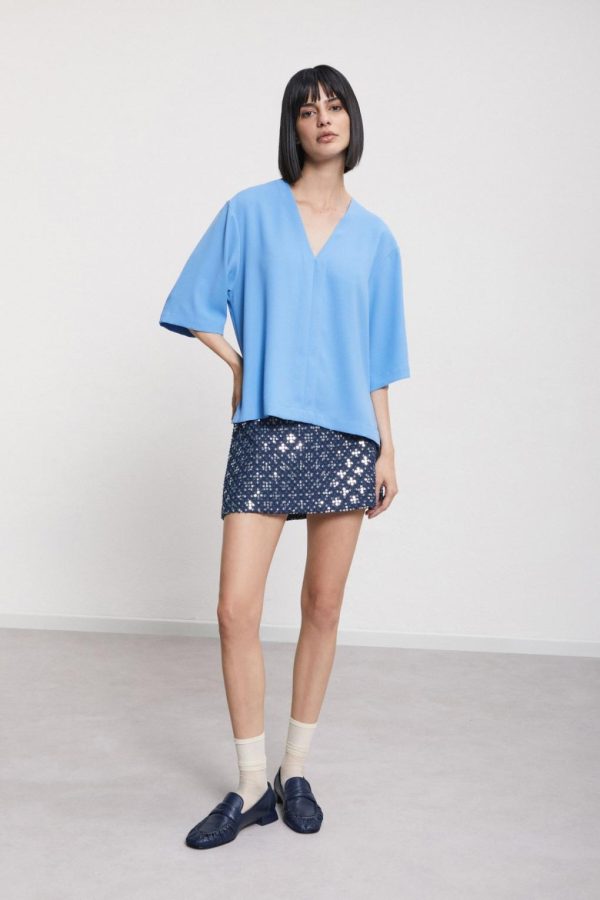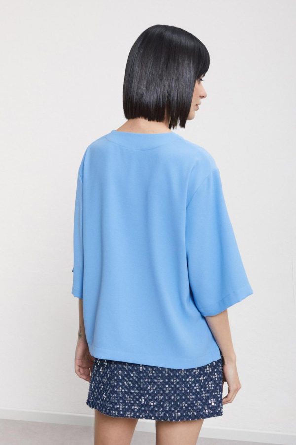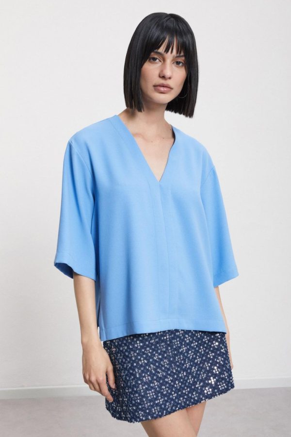 Solid blouse with V-neck and 3/4 sleeves.