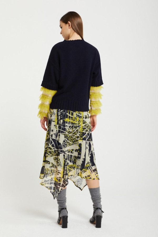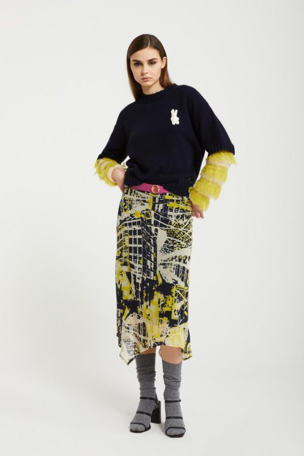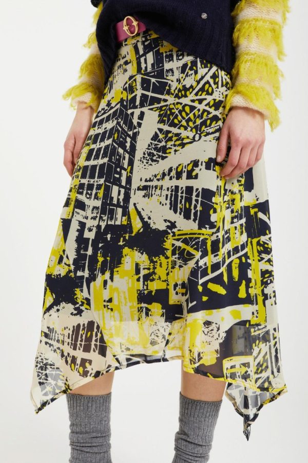 Printed pure viscose midi skirt with asymmetric hem. Sustainable Viscose Fabric The fabric of this garment is made by 100% viscose and it is produced respecting the environment. By choosing this piece you contribute to a better world.