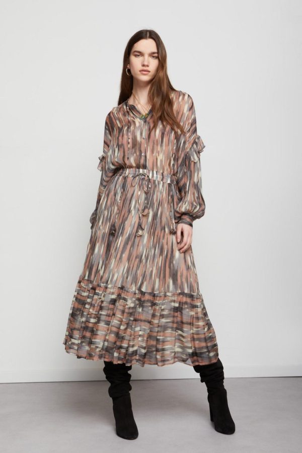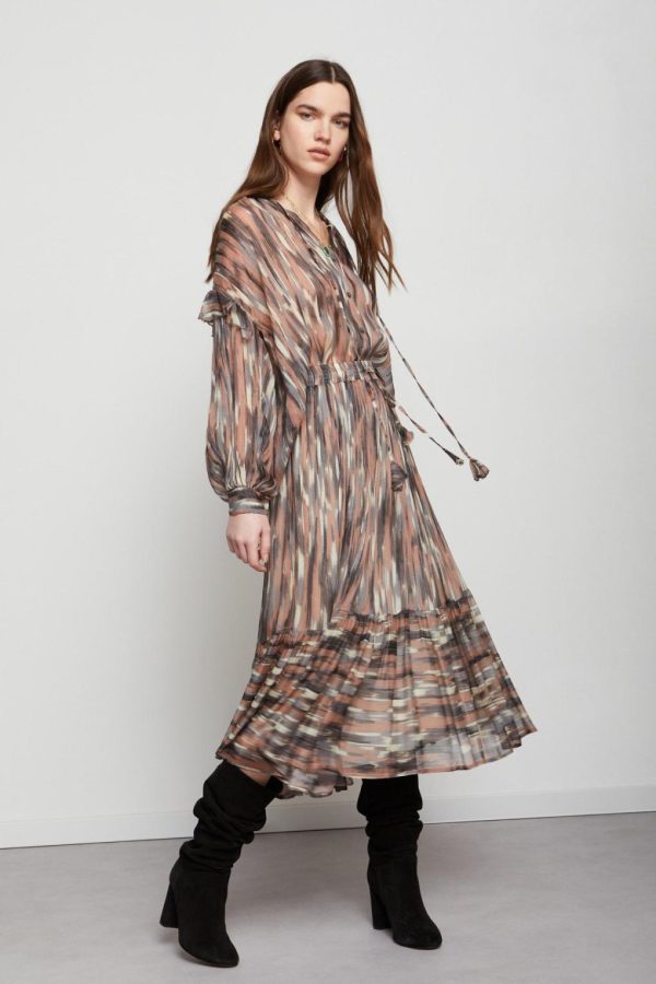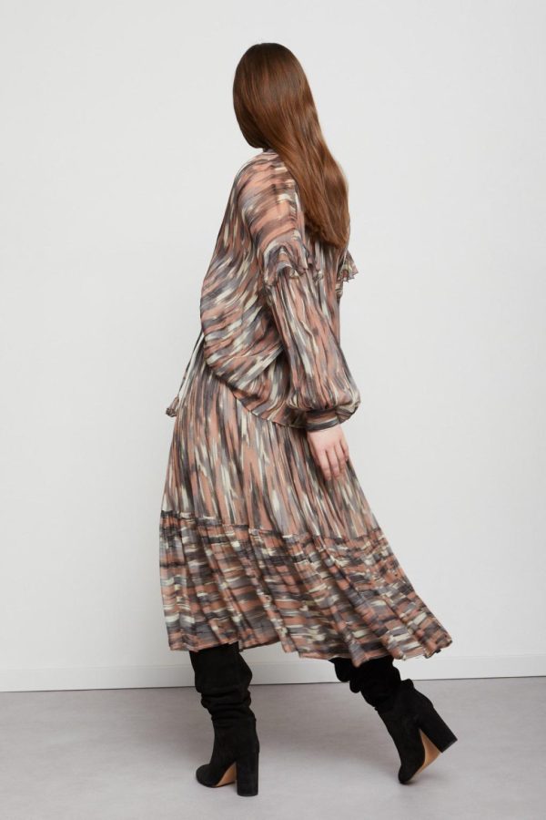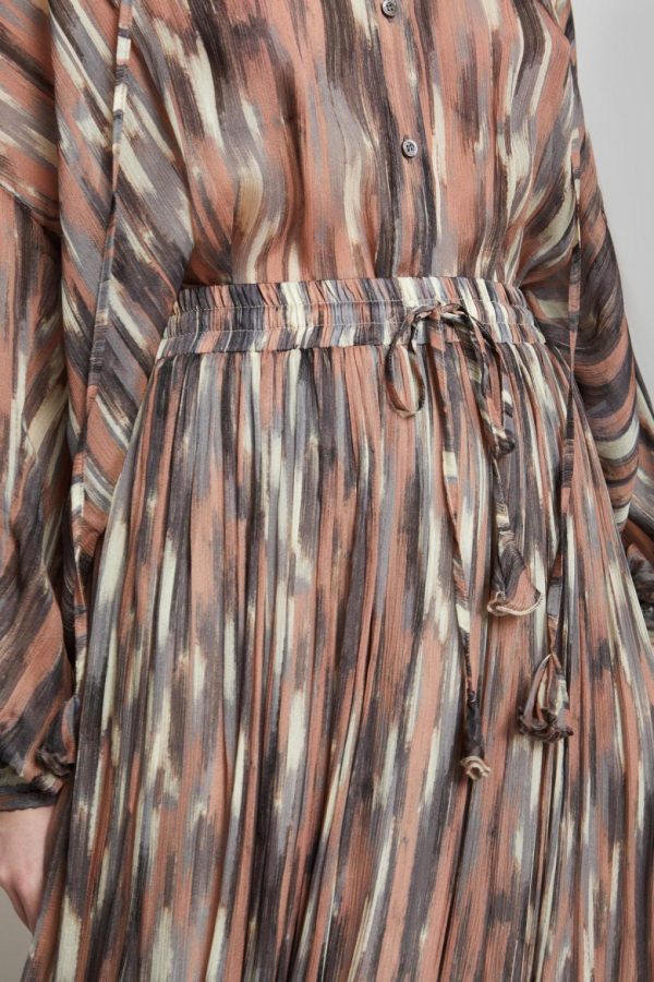 Printed pure viscose long skirt with frill and drawsting. Eco Viscose This fabric is made of 51% eco viscose fibers, which are derived from sustainable wood and pulp, coming from certified and controlled sources. By choosing this piece you contribute to a better world.