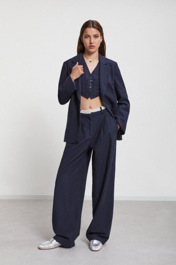 Linen straight-leg trousers with pleats and contrast pinstripe waistband.