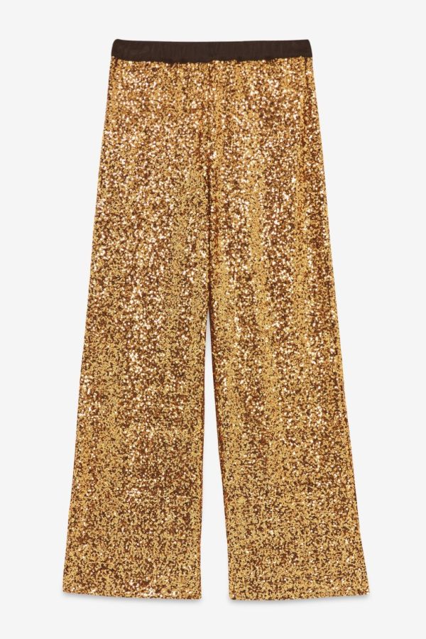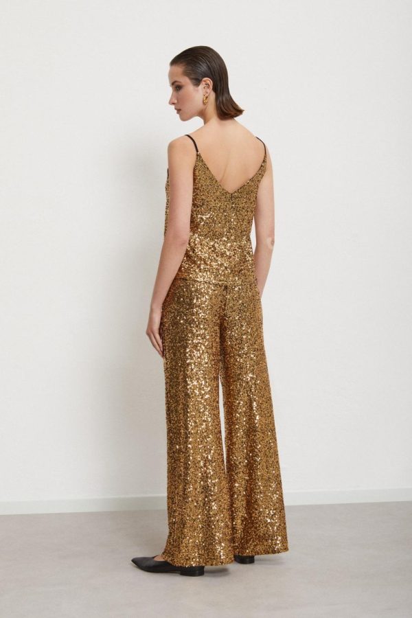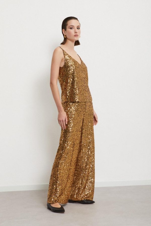 Palazzo trousers with all-over sequins and contrasting bustier.